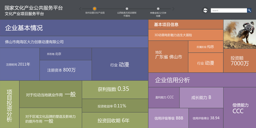 国家文化产业项目服务平台是文化部唯一的文化产业项目征集、管理、展示、推广、交易平台,汇集海量优质文化产业项目,集智能检索、数据分析、多维展示、舆情监测于一体,配套提供文化企业信用评级、文化产业项目评价、版权资产评估等专项金融服务,有效满足文化产业各类主体的使用需求